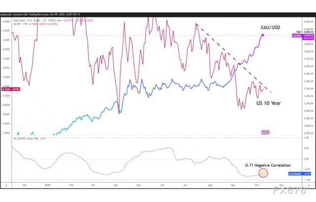 持续存在的降息预期已导致10年期美债收益率稳步下行,目前徘徊在4%关口附近。在此背景下,黄金作为避险资产及债券的天然替代品,正从收益率回落中受益,这有力支撑了其需求表现。过去50个交易日内,两类资产的相关系数达-0.71,显现出强烈的负相关关系——债券收益率下跌总是伴随着金价上扬。这表明资金从固定收益市场向黄金的轮动仍在持续支撑需求,不过这种关联性或将随市场环境变化而改变。
