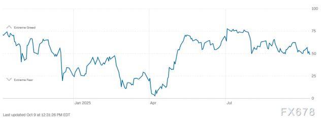 黄金仍是避险资产吗? 当前持续的美国政府停摆事件,引发了人们对政治和体制风险的担忧,略微挫伤了市场信心。这一影响可以在“恐惧与贪婪指数”中观察到:市场情绪已呈现稳定的下降趋势,正逼近50点水平,逐渐接近“恐惧”区间。