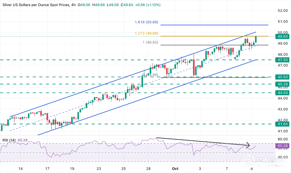 【华通白银网10月10日讯】•白银触及约49.70美元新高,接近50.00美元心理水平。
