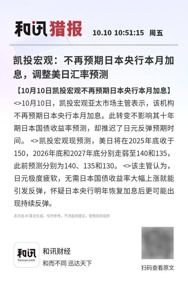 【10月10日凯投宏观不再预期日本央行本月加息】10月10日,凯投宏观亚太市场主管表示,该机构不再预期日本央行本月加息。此转变不影响其十年期日本国债收益率预测,却推迟了日元反弹预期时间。 凯投宏观现预测,美日将在2025年底收于150,2026年底和2027年底分别走弱至140和135,此前预测分别为140、135和130。 该主管认为,日元极度疲软,无需日本国债收益率大幅上涨就能引发反弹,怀疑日本央行明年恢复加息后更可能出现持续反弹。
