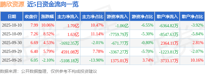 10月10日的资金流向数据方面,主力资金净流入1.7亿元,占总成交额10.47%,游资资金净流出1.06亿元,占总成交额6.55%,散户资金净流出6364.82万元,占总成交额3.92%。