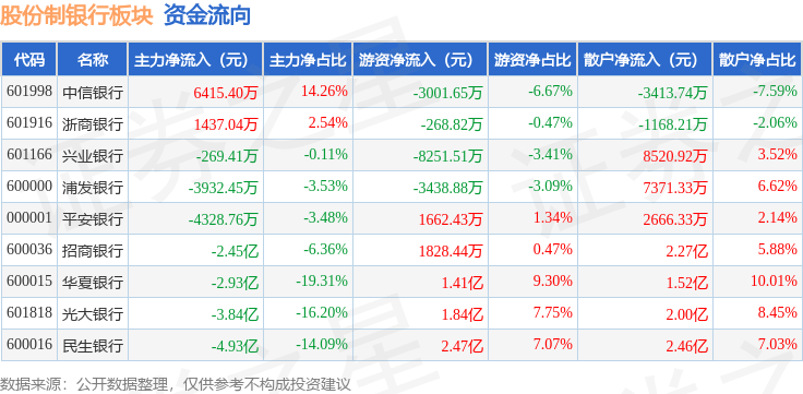 从资金流向上来看,当日股份制银行板块主力资金净流出14.22亿元,游资资金净流入4.57亿元,散户资金净流入9.64亿元。股份制银行板块个股资金流向见下表: