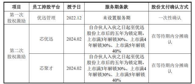 对此,优迅股份表示,报告期内,公司员工股权激励计划共两次,其中:2022年12月的第一次员工股权激励计划(以下简称“2022年股权激励”)为一次性授予股票,无服务期约定;2024年2月的第二次员工股权激励计划为限制性股票(以下简称“2024年股权激励”),同样为一次性授予,但存在服务期锁定约定。