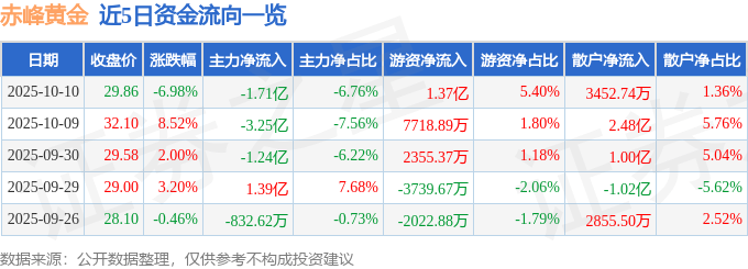 证券之星消息,截至2025年10月10日收盘,赤峰黄金(600988)报收于29.86元,下跌6.98%,换手率5.05%,成交量84.04万手,成交额25.36亿元。