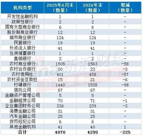 金融监管总局公布的最新银行业金融机构法人名单显示,截至今年6月末,全国共有4070家银行业金融机构,与2024年末相比减少225家。