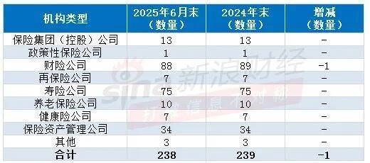 除了银行业金融机构法人名单,金融监管总局亦披露了保险机构法人名单。整体来看,截至今年6月末,我国共有238家保险机构,与上年末相比数量减少1家。