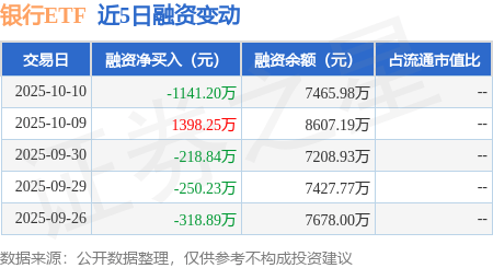 证券之星消息,10月10日,银行ETF(159887)融资买入3140.82万元,融资偿还4282.02万元,融资净卖出1141.2万元,融资余额7465.98万元,近20个交易日中有11个交易日出现融资净买入。