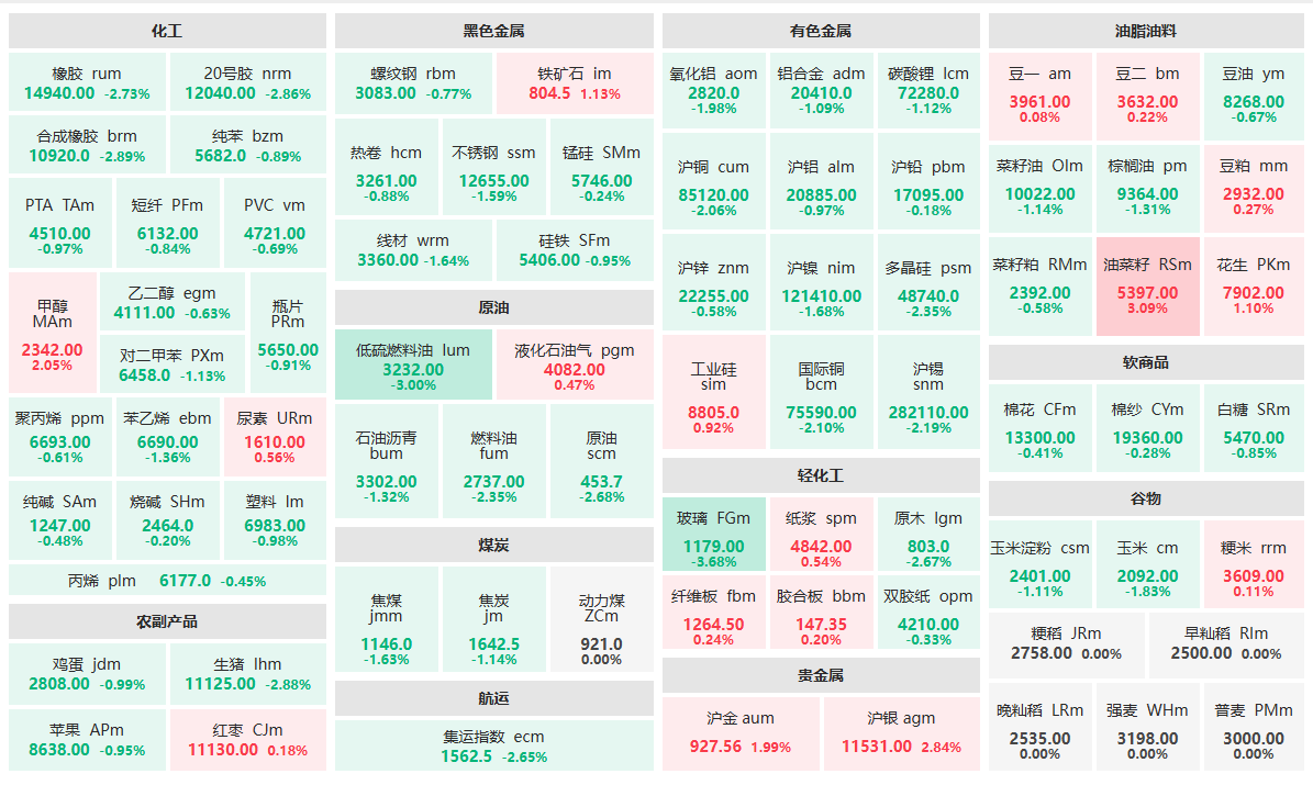农产品板块,油菜籽大涨超3%,菜籽油、棕榈油、玉米、玉米淀粉、生猪跌超1%。