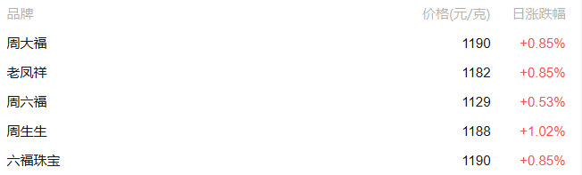 记者查询国内金饰价格,周生生今日金饰价格1188元/克,昨日价格1176元/克,上涨12元/克;老庙黄金今日金饰价格1189元/克,昨日价格1183元/克,上涨6元/克。周大福足金金饰克价1190元,老凤祥足金金饰克价1188元,老凤祥足金金饰克价1182元。