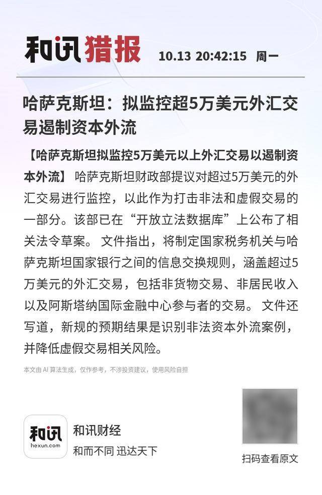 【哈萨克斯坦拟监控5万美元以上外汇交易以遏制资本外流】哈萨克斯坦财政部提议对超过5万美元的外汇交易进行监控,以此作为打击非法和虚假交易的一部分。该部已在“开放立法数据库”上公布了相关法令草案。 文件指出,将制定国家税务机关与哈萨克斯坦国家银行之间的信息交换规则,涵盖超过5万美元的外汇交易,包括非货物交易、非居民收入以及阿斯塔纳国际金融中心参与者的交易。 文件还写道,新规的预期结果是识别非法资本外流案例,并降低虚假交易相关风险。