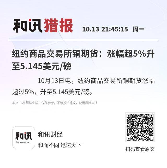 10月13日电,纽约商品交易所铜期货涨幅超过5%,升至5.145美元/磅。