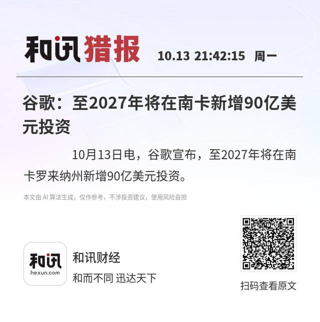 10月13日电,谷歌宣布,至2027年将在南卡罗来纳州新增90亿美元投资。