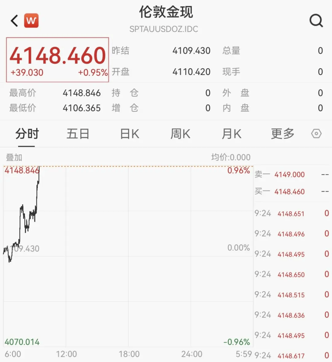 14日,COMEX黄金期货价格同样走高,一度升破4150美元/盎司,再创历史新高。