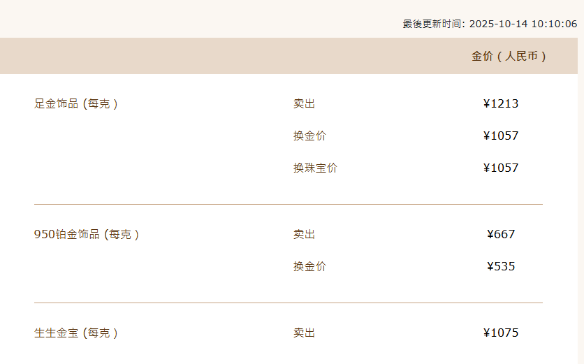 记者查询国内金饰价格,周生生今日金饰价格1213元/克,昨日价格1188元/克,上涨25元/克。