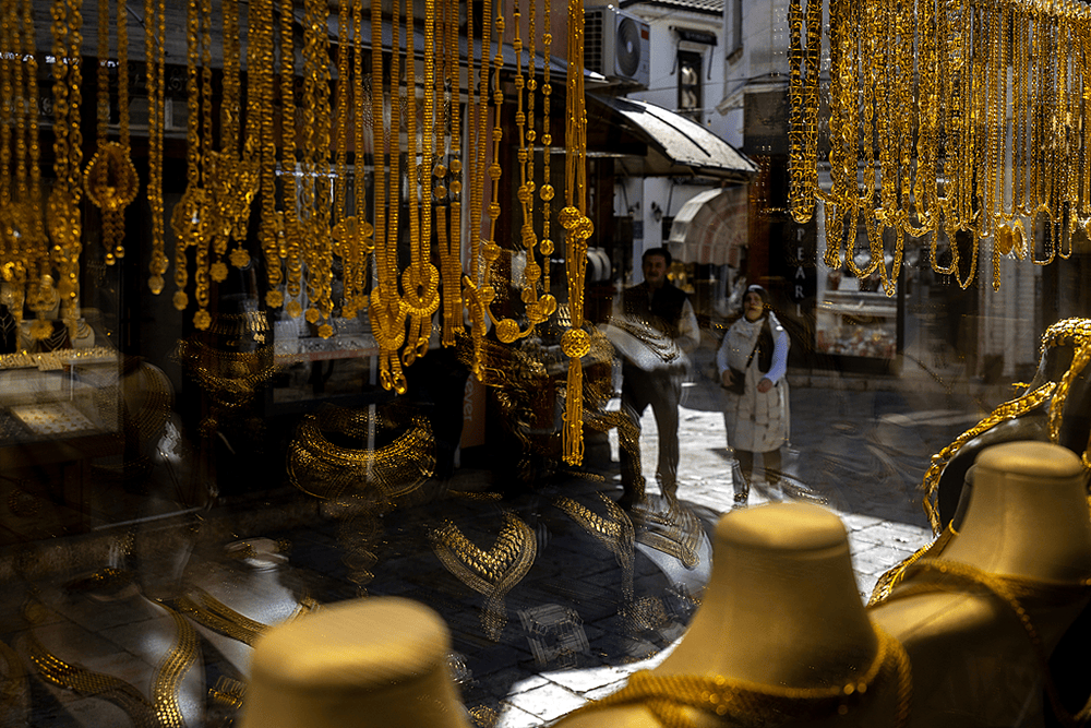 当地时间2025年10月9日,北马其顿斯科普里,人们经过集市的一家黄金珠宝店橱窗。视觉中国 资料图