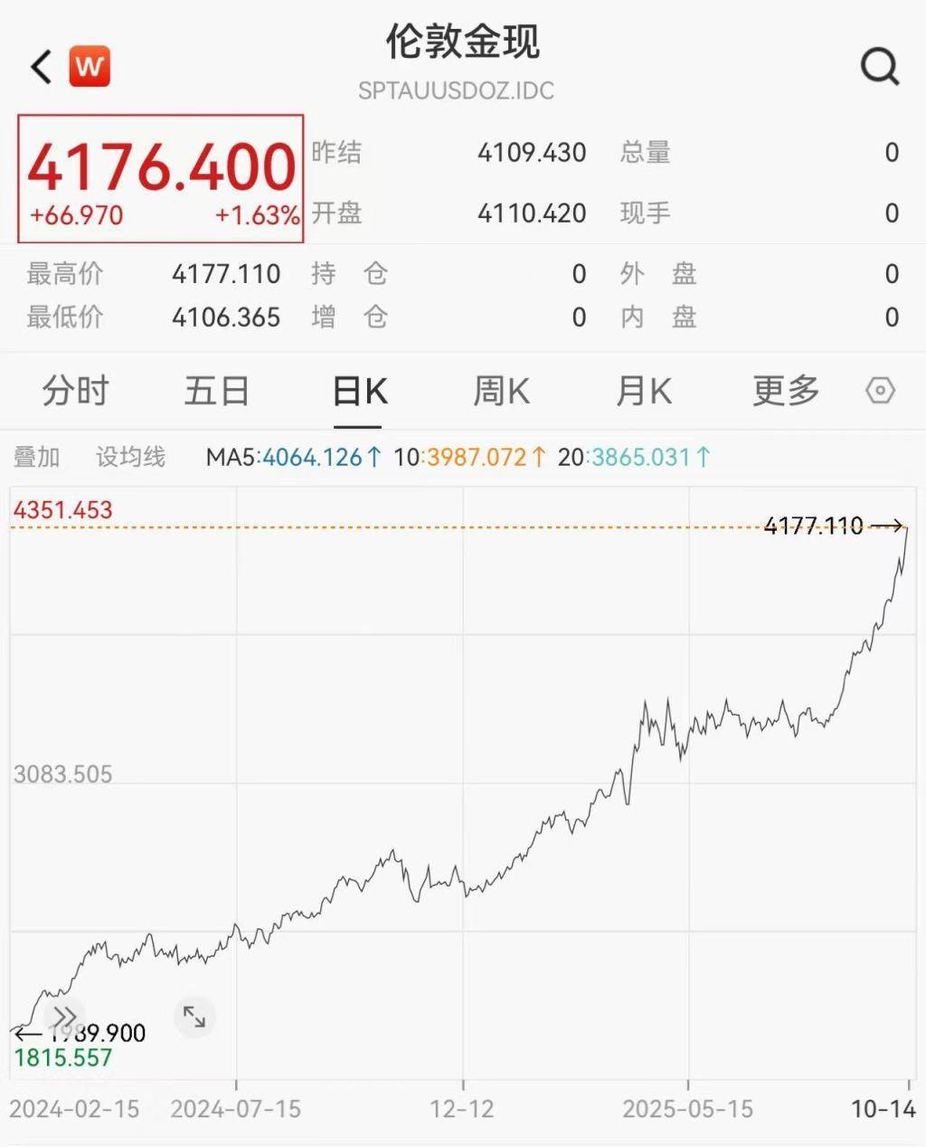 10月14日,现货黄金涨超1%,史上首次站上4170美元/盎司,再创历史新高,年内累涨超1500美元,涨幅超58%。