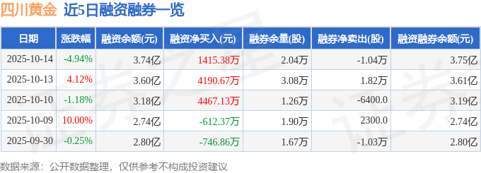 四川黄金融资融券信息显示,融资方面,当日融资买入1.41亿元,融资偿还1.27亿元,融资净买入1415.38万元,连续3日净买入累计1.01亿元。融券方面,融券卖出900.0股,融券偿还1.13万股,融券余量2.04万股,融券余额60.81万元。融资融券余额3.75亿元。