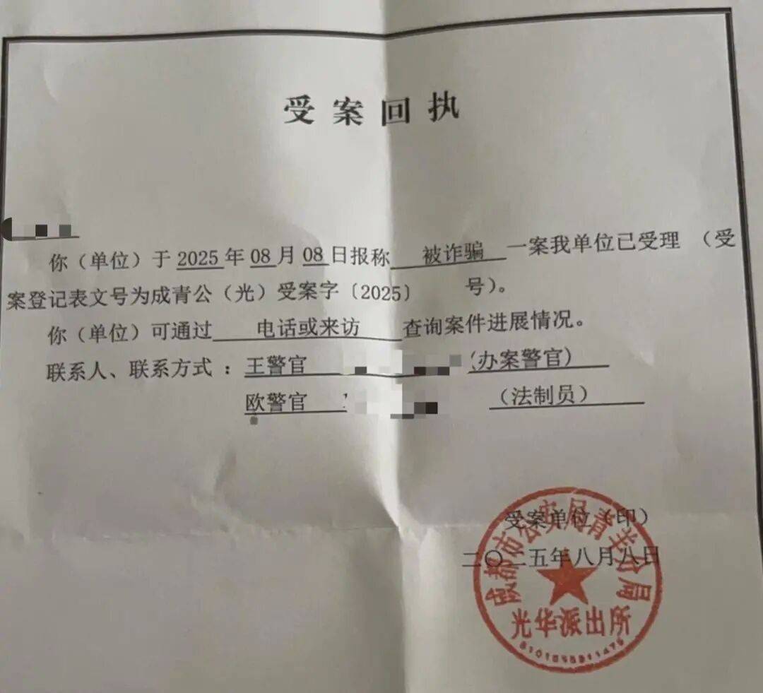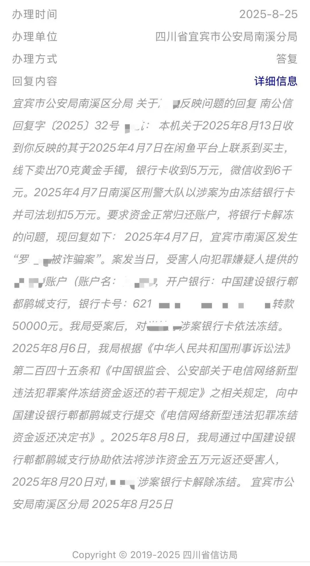 8月25日,宜宾公安南溪分局回复原先生称,2025年4月7日,宜宾市南溪区发生“罗某某被诈骗案”。案发当日,受害人向犯罪嫌疑人提供的原先生账户,转款5万元。我局受案后,对原先生涉案银行卡依法冻结。