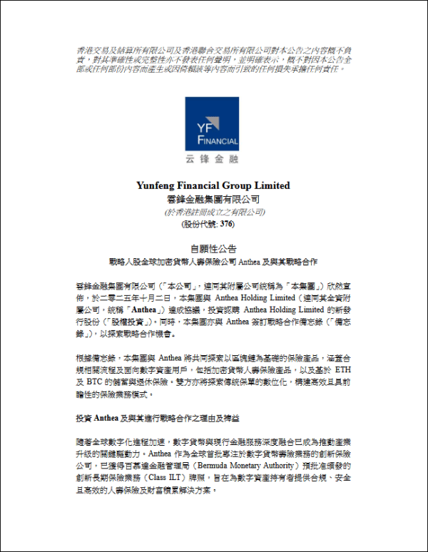 近日,港股科技金融公司云锋金融发布公告称,公司已于10月2日战略入股全球加密货币人寿保险公司Anthea Holding Limited(连同旗下子公司统称“Anthea”),并与Anthea签署战略合作备忘录。