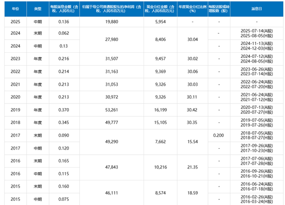 2018年以来,该行每年现金分红占归属于普通股股东净利润的比例一直保持30%以上,2024年内增加了中期分红。2024年全年共派发现金股利人民币84.06亿元,占归属于普通股股东净利润的30.04%。