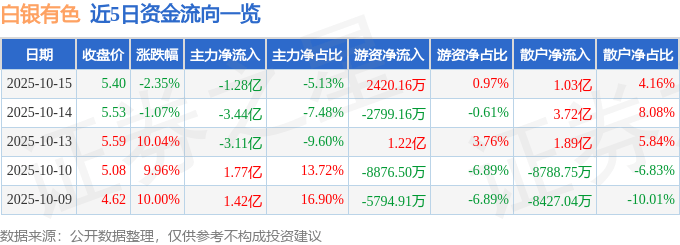 证券之星消息,截至2025年10月15日收盘,白银有色(601212)报收于5.4元,下跌2.35%,换手率6.27%,成交量464.59万手,成交额24.88亿元。
