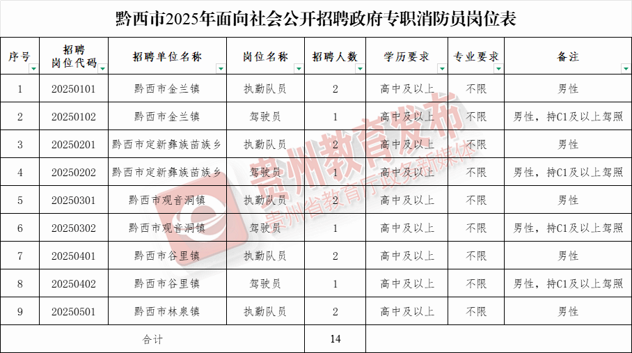☆招聘人数:面向社会公开招聘政府专职消防员 14名。岗位表——