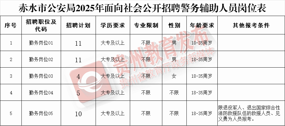 ☆招聘人数:赤水市公安局计划公开招聘警务辅助人员 41名。岗位表——