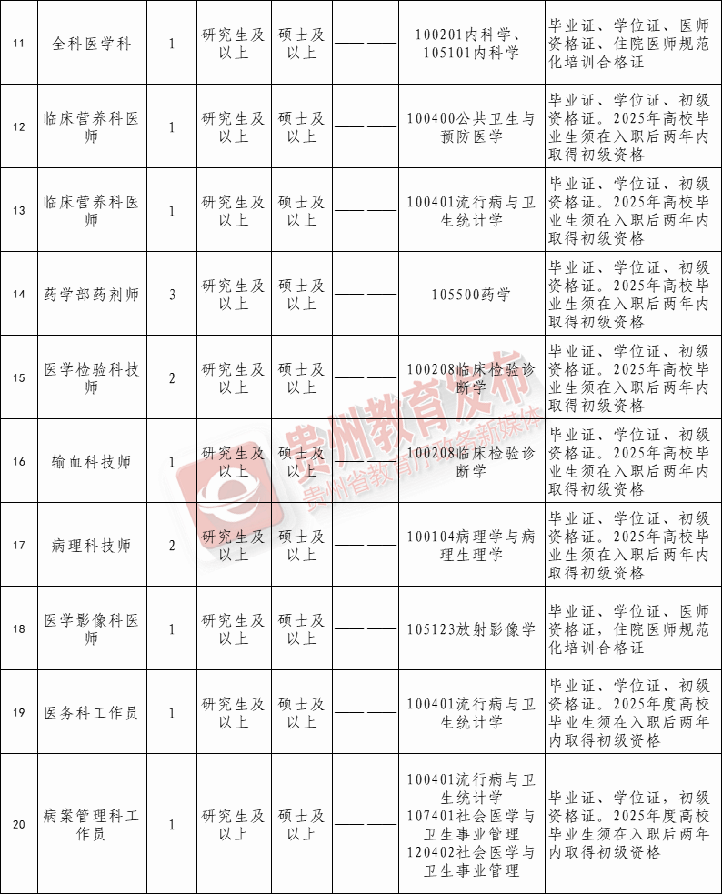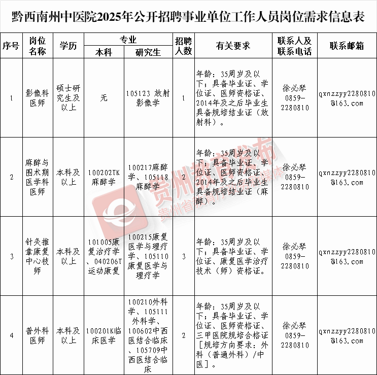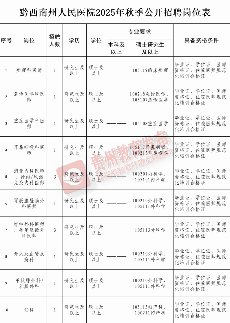 ☆报名时间:2025年10月13日至10月17日(工作日上午8:00-11:30,下午14:00-17:30);报名地点:黔西南州人民医院全科培训大楼8楼804室人事科。
