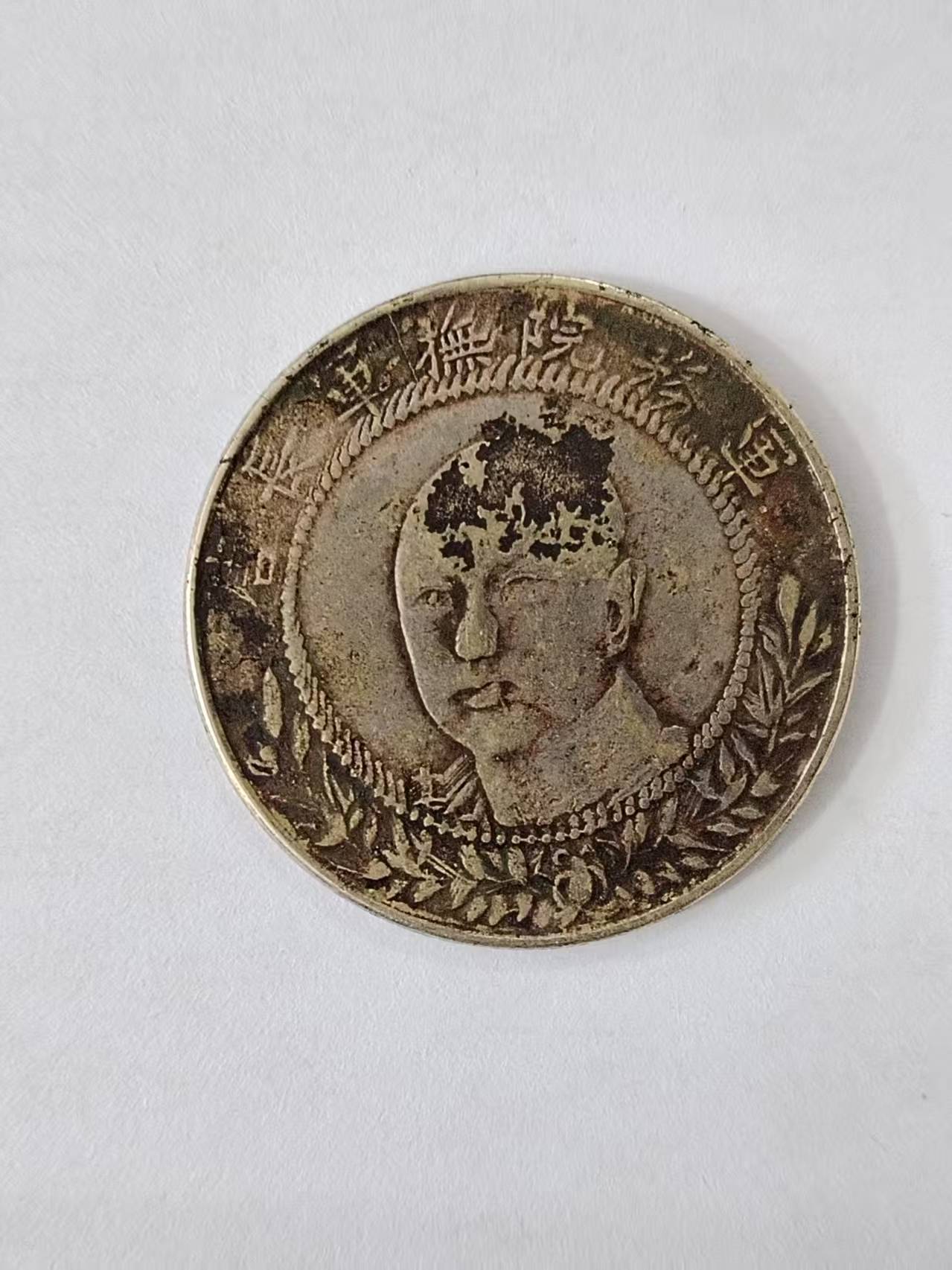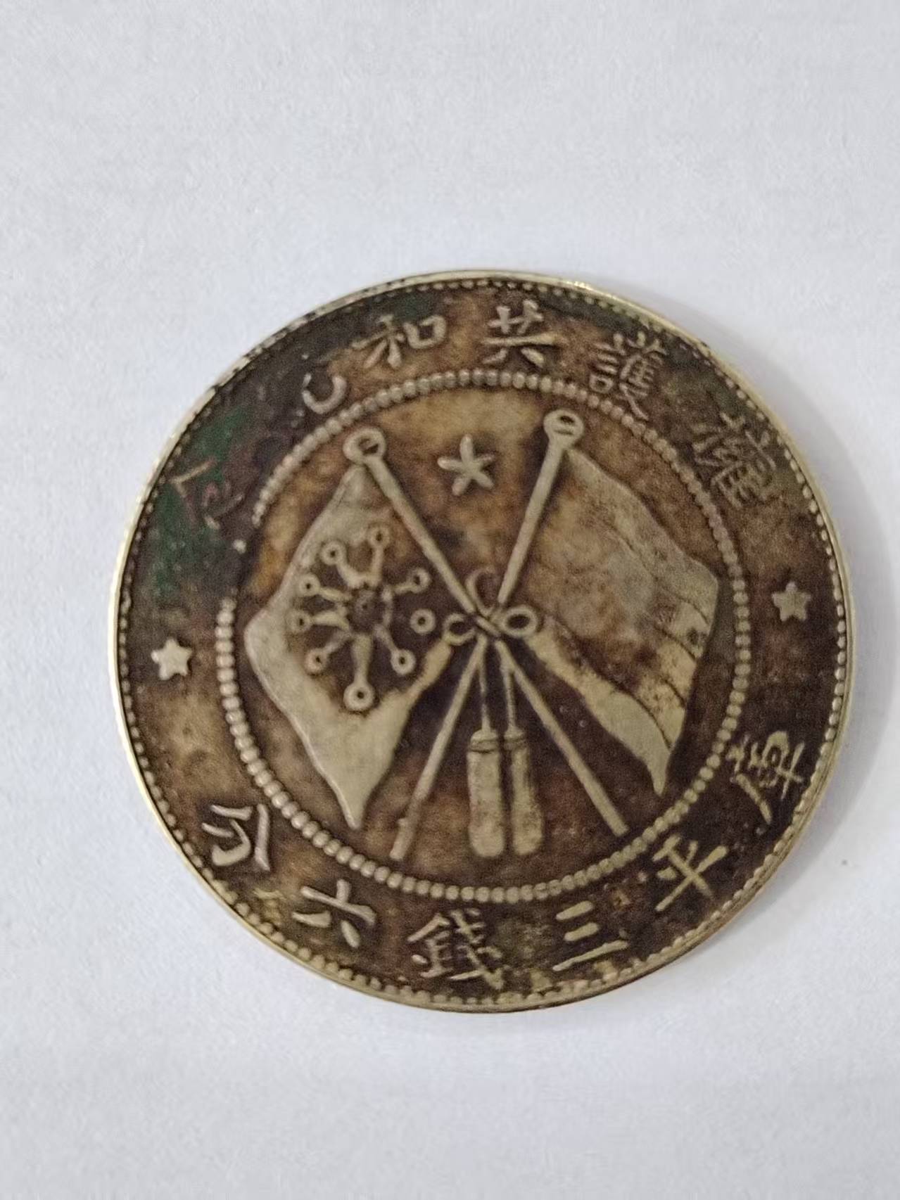 这是一枚“军务院抚军长唐”唐继尧“库平三钱六分”银币,直径32毫米,重11克。银币正面是唐继尧头像,背面是中华民国共和旗帜,背面文字注明是“拥护共和纪念”币。