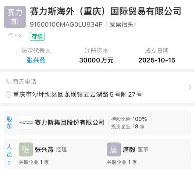 企查查App显示,10月15日,赛力斯海外(重庆)国际贸易有限公司成立,由赛力斯(601127.SH)全资持股,法定代表人为张兴燕,注册资本3亿元人民币,经营范围包括新能源汽车整车销售、汽车零配件零售、汽车装饰用品销售等。