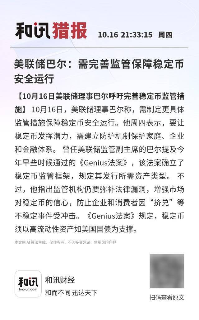 【10月16日美联储理事巴尔呼吁完善稳定币监管措施】10月16日,美联储理事巴尔称,需制定更具体监管措施保障稳定币安全运行。他周四表示,要让稳定币发挥潜力,需建立防护机制保护家庭、企业和金融体系。 曾任美联储监管副主席的巴尔提及今年早些时候通过的《Genius法案》,该法案确立了稳定币监管框架,规定其发行所需资产类型。 不过,他指出监管机构仍要弥补法律漏洞,增强市场对稳定币的信心,防止企业和消费者因“挤兑”等不稳定事件受冲击。《Genius法案》规定,稳定币须以高流动性资产如美国国债为支撑。