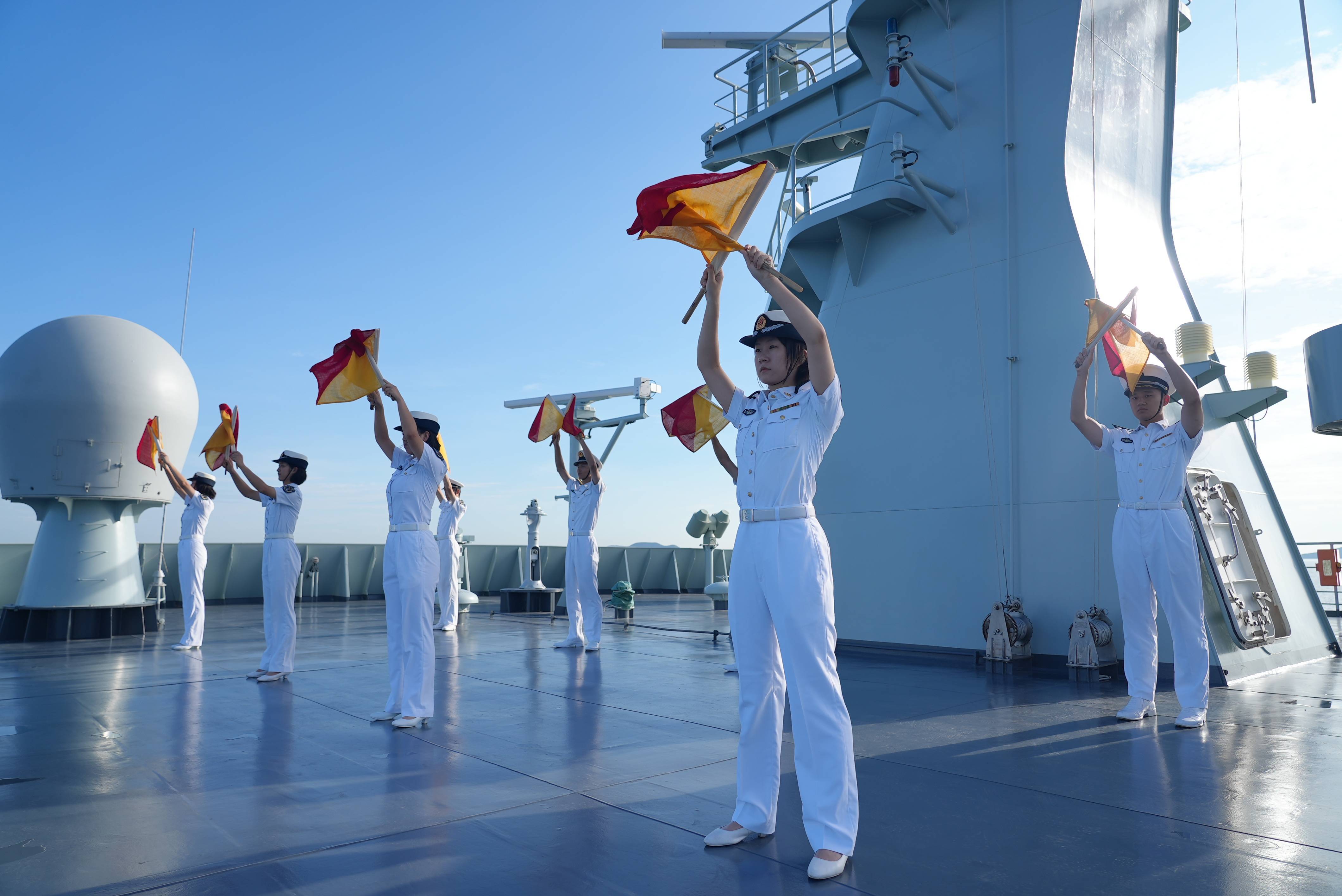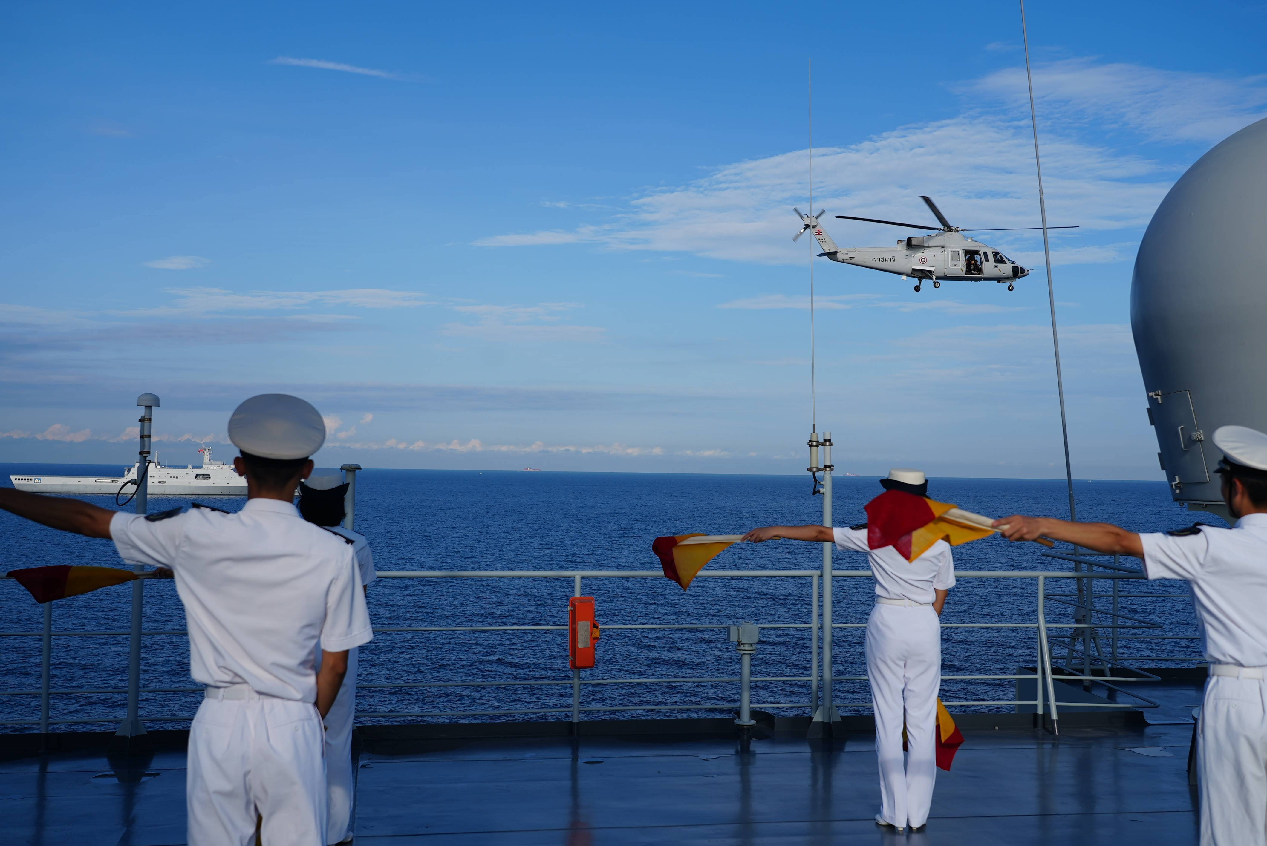 10月16日,戚继光舰官兵在指定海域向泰国“象岛”号登陆舰展示旗语。 新华社发