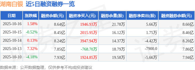 湖南白银融资融券信息显示,融资方面,当日融资买入2.65亿元,融资偿还2.46亿元,融资净买入1946.93万元,连续3日净买入累计7910.83万元。融券方面,融券卖出5.69万股,融券偿还300.0股,融券余量21.78万股,融券余额167.92万元。融资融券余额8.66亿元。