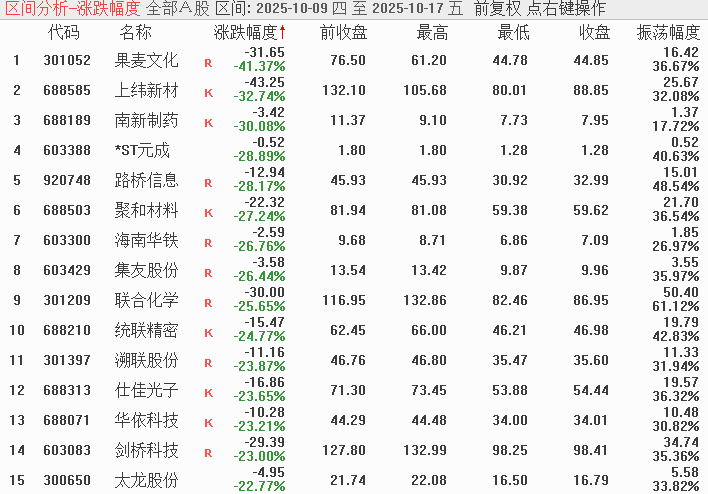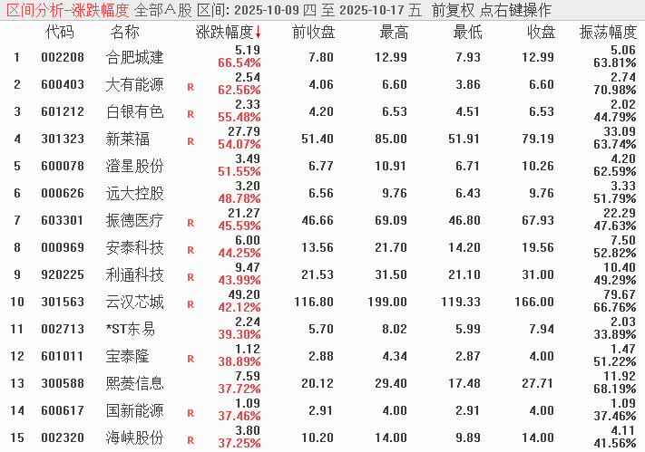 10月至今,上证指数剧烈震荡,有1622只股上涨,其中合肥城建、大有能源、白银有色、澄星股份涨幅居前。3763只个股下跌,上纬新材、海南华铁跌幅居前。市场赚钱难度较大。