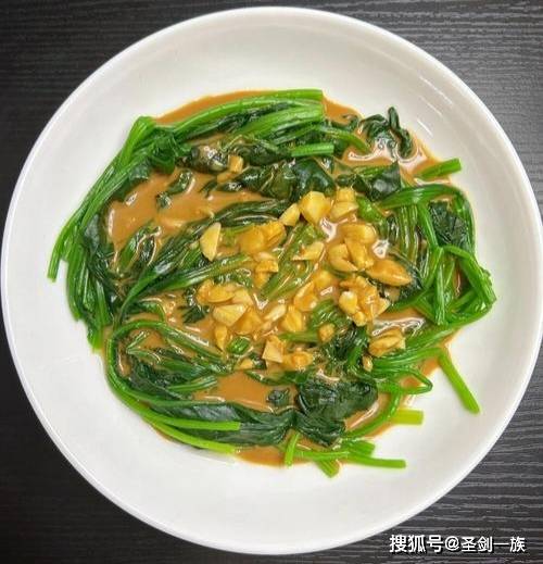 3. 将酱汁倒入菠菜中,搅拌均匀。