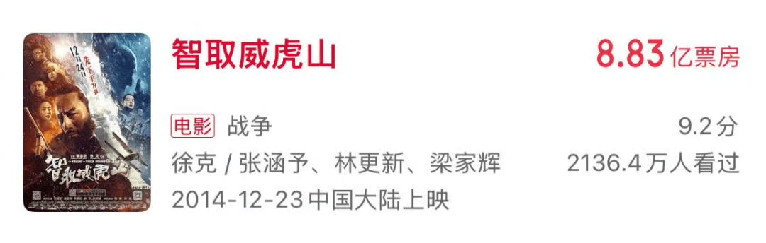 徐克的《智取威虎山》,用香港电影擅长的类型化手法重新拍红色经典,让老故事有了新节奏,把剿匪故事拍得悬念十足、很有张力。拿了 8.83 亿元票房;