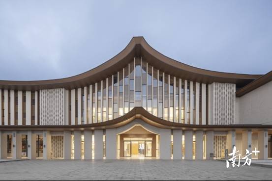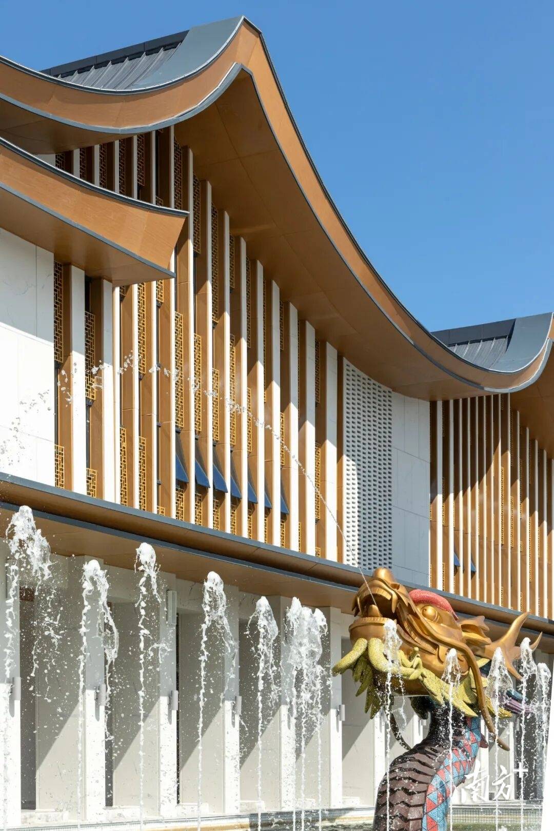室外场景中,西区服务楼前万余片潮汕嵌瓷精制的“彩瓷巨龙”昂首腾空,展现“龙腾四海”气势;东区服务楼前7米高的木质水车叮咚转动,还原客家先民劳作场景,成为自然与人文的动态连接点。