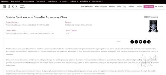 近日,全球性设计大奖缪斯设计奖(MUSE Design Awards)正式揭晓获奖名单,汕梅高速水车服务区凭借鲜明的客潮地域文化表达与创新空间设计,从全球众多参评作品中脱颖而出,斩获建筑设计——交通类别最高奖项“铂金奖”。