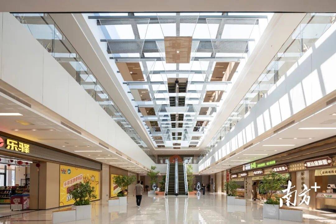 室内空间里,中庭天花取客家“米斗”形制象征丰收,座椅化用“帆船”意象寓意归航,墙面镶嵌客家、潮汕方言及拼音标注;东区大堂“千家万户”造型以客家土楼剪影构成立面,灯光映照下呈现“万家灯火”温情,让文化在细节中自然流淌。