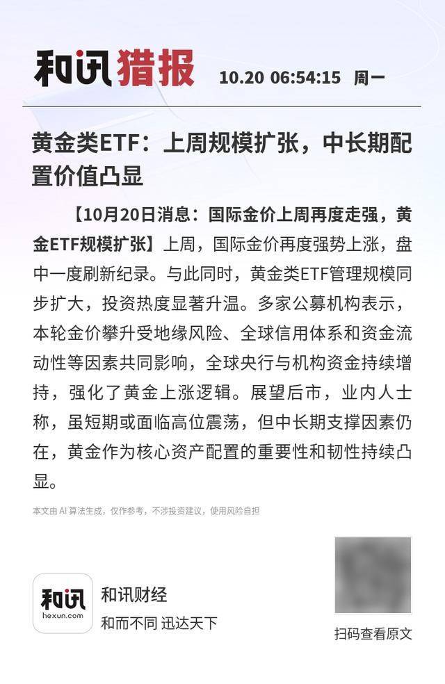 【10月20日消息:国际金价上周再度走强,黄金ETF规模扩张】上周,国际金价再度强势上涨,盘中一度刷新纪录。与此同时,黄金类ETF管理规模同步扩大,投资热度显著升温。多家公募机构表示,本轮金价攀升受地缘风险、全球信用体系和资金流动性等因素共同影响,全球央行与机构资金持续增持,强化了黄金上涨逻辑。展望后市,业内人士称,虽短期或面临高位震荡,但中长期支撑因素仍在,黄金作为核心资产配置的重要性和韧性持续凸显。