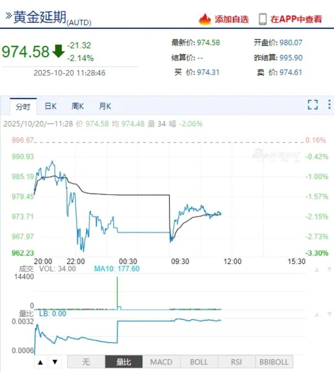上海黄金交易所报价974.58元/克,跌2.14%。