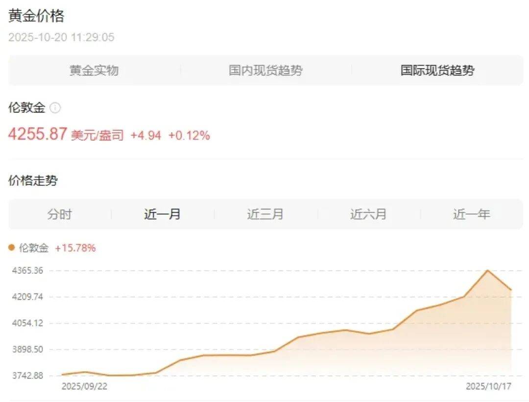 本月,黄金国际现货价格屡创历史新高,一度站上4350美元/盎司,目前已较高点跌去近百美元。