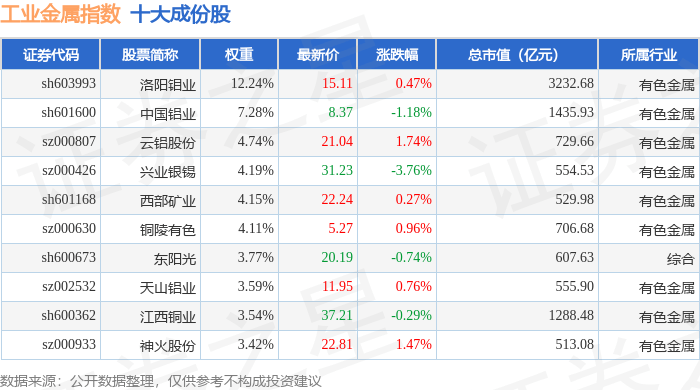 证券之星消息,10月20日,工业金属(980043)指数报收于2559.14点,跌0.45%,成交511.46亿元,换手率2.42%。当日该指数成份股中,上涨的有27家,楚江新材以6.13%的涨幅领涨,下跌的有23家,白银有色以9.95%的跌幅领跌。