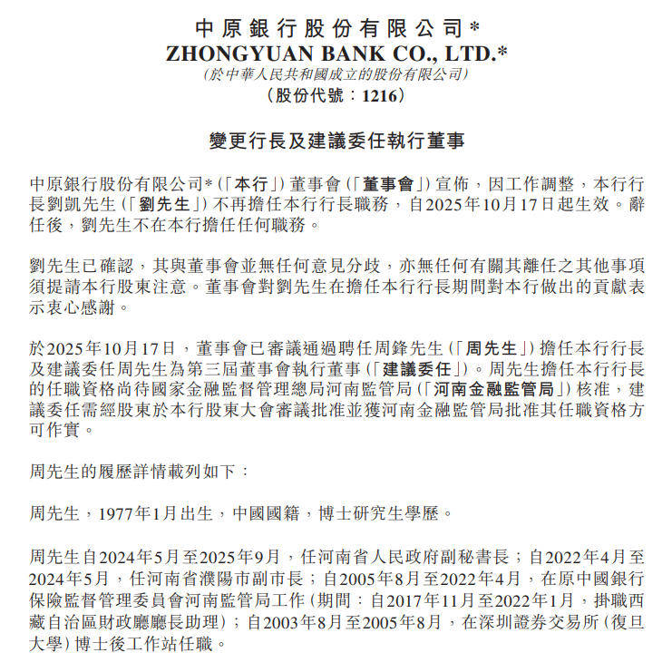 10月17日,中原银行股份有限公司(01216.HK,下称“中原银行”)发布公告称,因工作调整,刘凯不再担任该行行长职务,自2025年10月17日起生效。辞任后,刘凯不在该行担任任何职务。