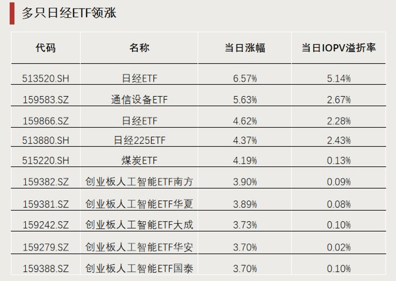 ETF方面,多只日经ETF领涨,其中,日经ETF(513520)上涨6.57%,排在全市场ETF之首。此外,多只创业板人工智能ETF涨超3%。