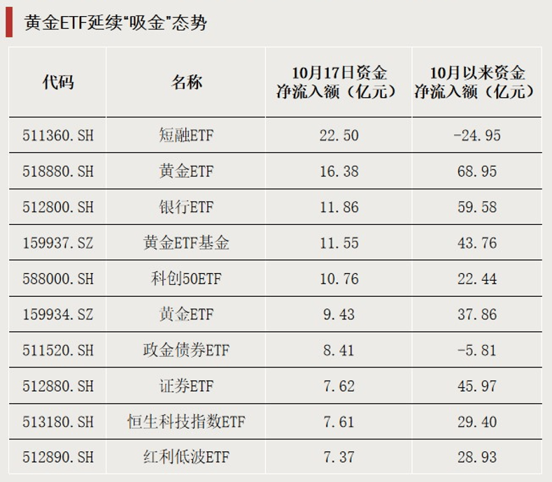 10月17日,短融ETF(511360)获超20亿元资金净流入,多只黄金ETF显著“吸金”。