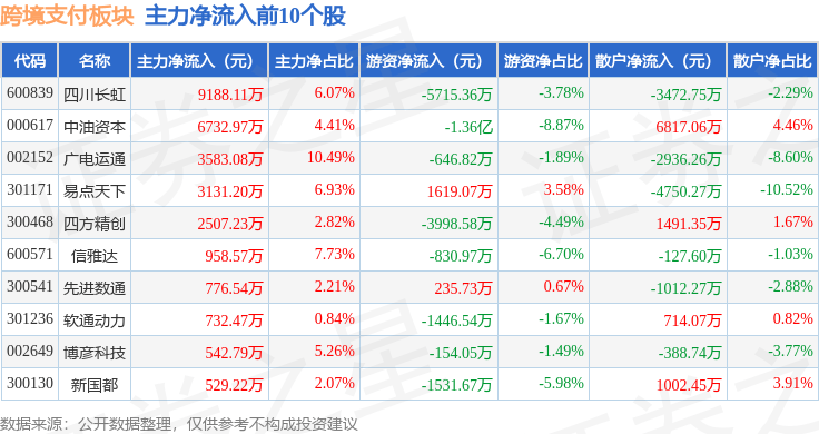 从资金流向上来看,当日跨境支付板块主力资金净流出9128.98万元,游资资金净流出2.5亿元,散户资金净流入3.42亿元。跨境支付板块个股资金流向见下表: