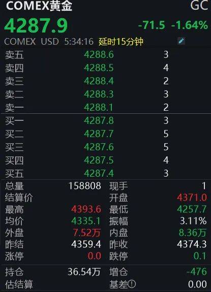 期货方面,COMEX黄金期货亦出现回调。截至记者发稿,COMEX黄金期货日内跌1.64%,报4287.9美元/盎司,盘中最高触及4393.6美元/盎司,最低则跌至4257.7美元/盎司。