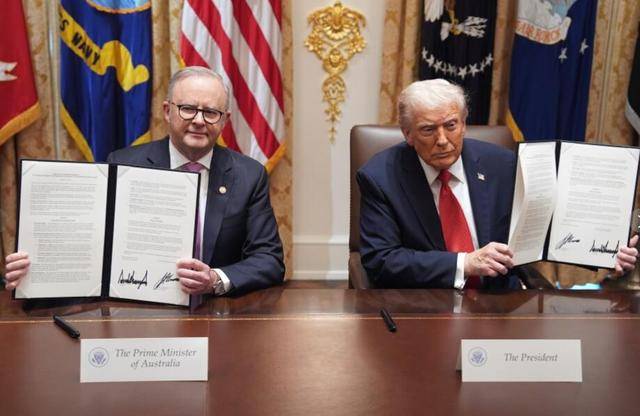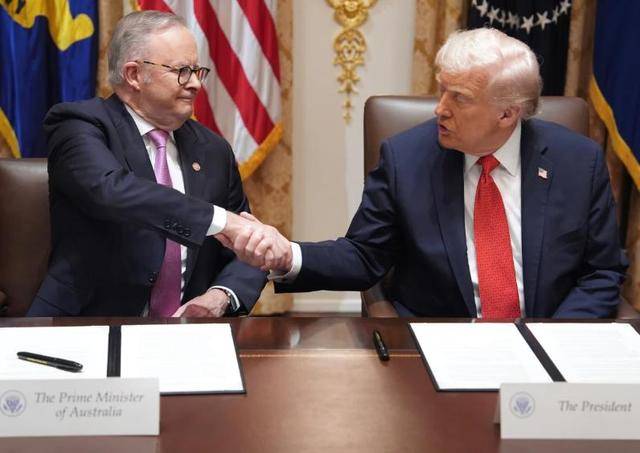 澳大利亚方面对关键矿产协议反应积极。当地媒体强调,这是两国在资源安全领域的突破。白宫官方发布的照片中,特朗普与阿尔巴尼斯在签字桌前并肩站立,背景屏幕显示“85亿美元合作框架”。