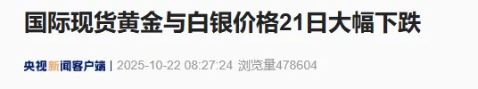 据央视新闻客户端消息,当地时间21日,受地缘政治、投资者获利止盈等多重因素影响,黄金、白银遭遇市场广泛抛售。